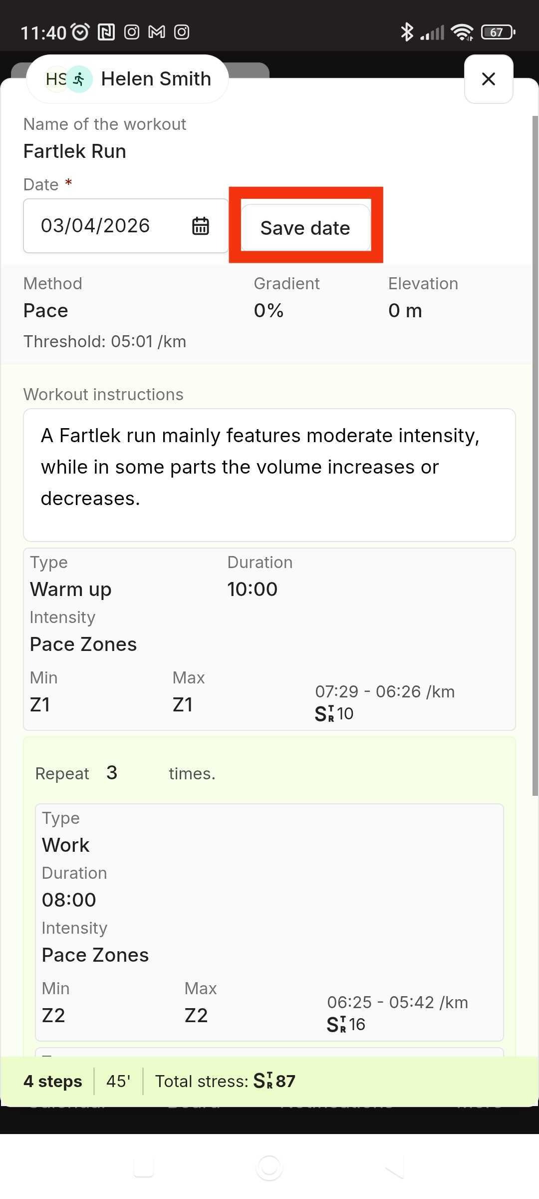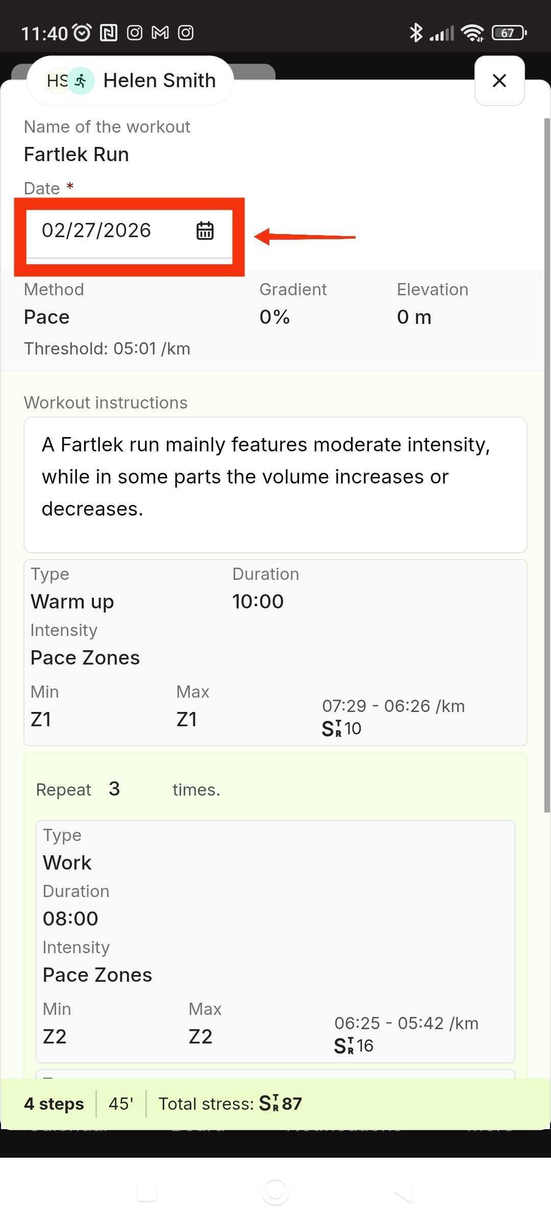 At the top of the workout details, click on the Date field.